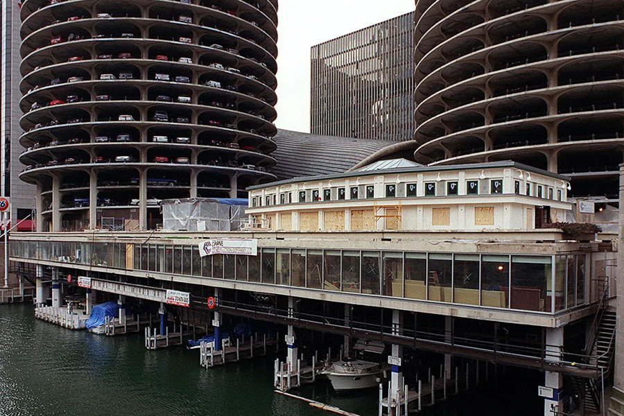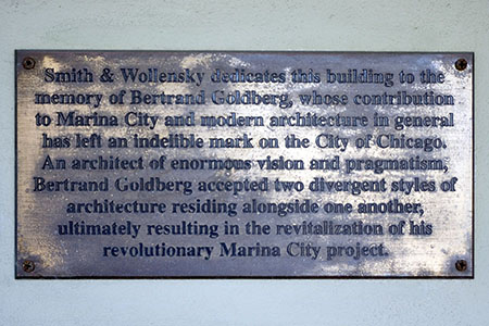 (Left) Weathered plaque near the northeast corner of Smith & Wollensky. The plaque reads, “Smith & Wollensky dedicates this building to the memory of Bertrand Goldberg, whose contribution to Marina City and modern architecture in general has left an indelible mark on the City of Chicago. An architect of enormous vision and pragmatism, Bertrand Goldberg accepted two divergent styles of architecture residing alongside one another, ultimately resulting in the revitalization of his revolutionary Marina City project.” |