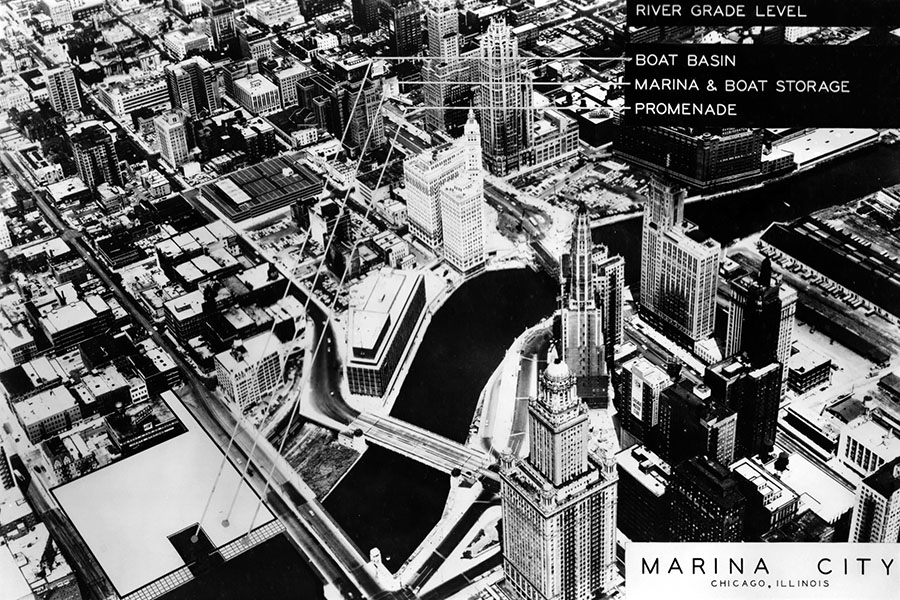 “Bud came up with a bunch of different names and his preference was River City,” recalled Howard Swibel in 2008. “But my mother loved the name Marina City. And she told me she remembers discussing with Bud and insisting that it be Marina City. She liked the idea because the marina was there.”