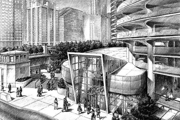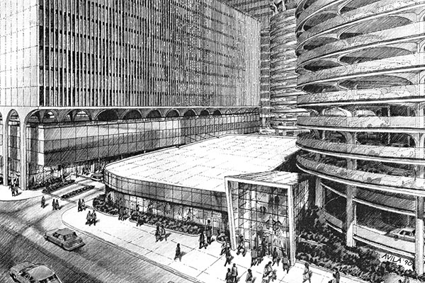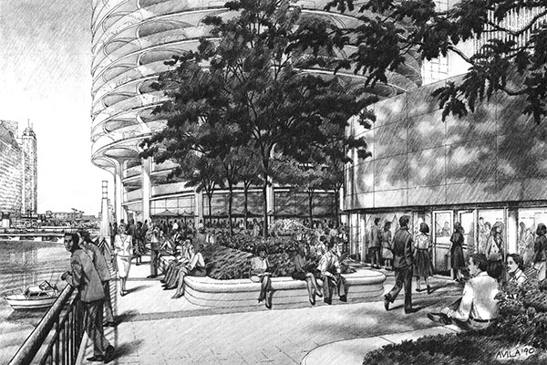 (Left) A retail addition on the State Street side of Marina City, proposed in 1990 by Hiffman Shaffer Anderson Inc. Tucked under a level of the parking ramp would have been a new building where Smith & Wollensky is located today. At left, new steps would provide quick access to the plaza. |