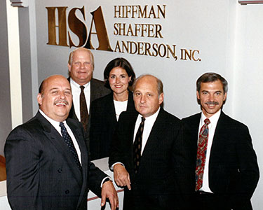(Right) 1990 group photo of Hiffman Shaffer Anderson Inc. (Left to right) William Skrezlowski, Daniel Anderson, Grace Wilkie, Dennis Hiffman, and Mark Muneretto. |
