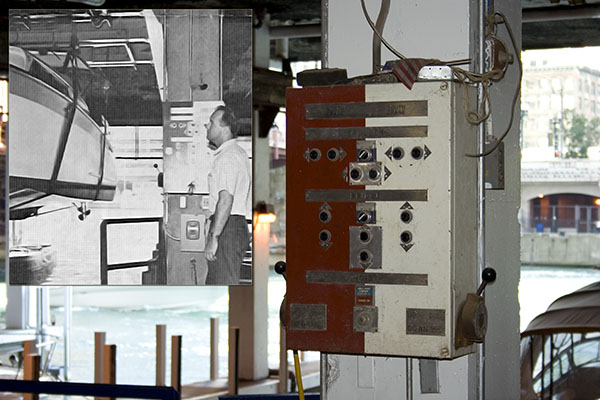 (Left) Hoist control, photographed in 2007. (Inset) Marina manager Tom Dollnig, photographed in 1964 operating an electric hoist capable of lifting a craft weighing six tons. |
