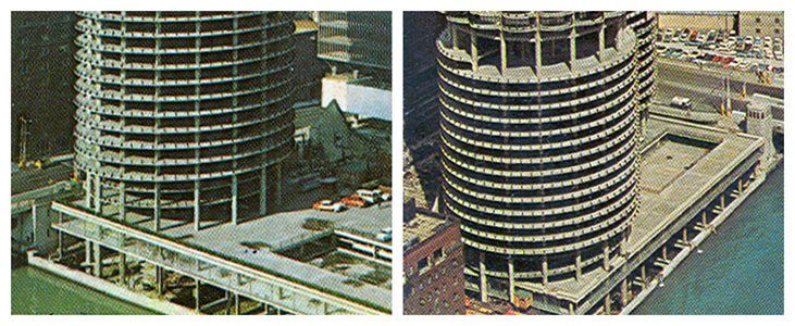 (Above) Detail from two postcards showing the seawall still in place at Marina City. (Left) Detail from a postcard published by Aero Distributing Co., Inc., circa 1963. (Right) Detail from a 1963 postcard photographed by Larry Dodson for Cameo Greeting Cards, Inc.