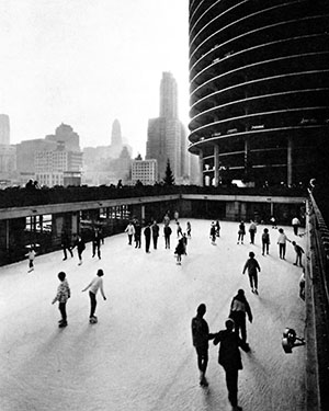 The skating rink at Marina City was 110 feet long by 50 feet wide. Open from noon to 10:00 p.m. every day except Monday, it enticed skaters from the southeast corner next to the east tower and State Street. It had a skate shop, warming room, and professional skaters available for lessons. (Left) Photo from 1985 book Dans La Ville of the skating rink at Marina City in 1965 and restaurants on the lower level. West tower in distance at right. |