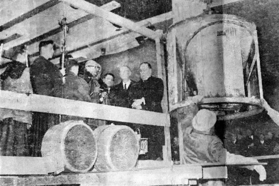 After remarks by city and county officials, labor leaders, bankers, and representatives of the construction company, the bucket was sent up to the 65th floor.