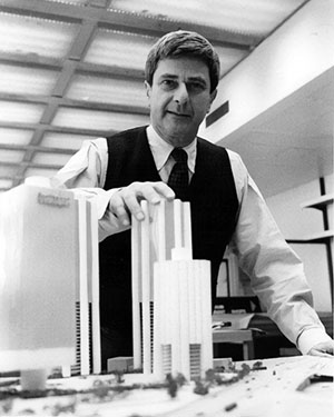 Goldberg may have been long on talent, but recalls Howard Swibel, he was “not the best businessman. There were cost overruns and there were a lot of inefficiencies. The project ended up costing more than they anticipated. And my father used to blame [Goldberg] for that because the design and the estimates were not reliable.” (Left) Bertrand Goldberg with a model of a project in Detroit. |