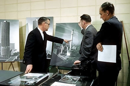 (Left) Dr. Peck points out the core of the east tower in this photo by Portland Cement Association from the early 1960s. |