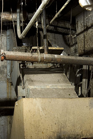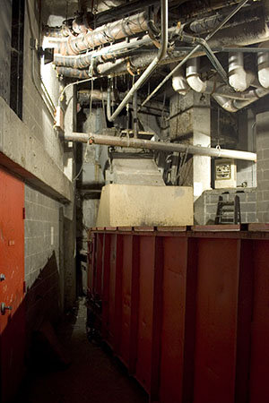 (Left) The last stop for garbage in Marina City’s east tower, photographed on January 30, 2013. The compactor at lower right is about five feet high. A photoelectric switch detects trash falling down the chute and switches on the compactor. |