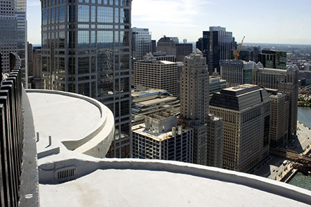 (Left) As it looked in June 2010, this was Mike Leonard’s office for about two weeks in 1966. This is the west edge of Marina City’s west tower observation deck, overlooking the Loop and the Chicago River. |