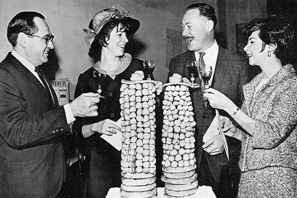 (Left) At a wine tasting party at Marina City Drugs & Liquors in mid-1965, a replica of Marina City has been fashioned from cream puffs. Left to right: E. Leonard Solomon, co-owner of the pharmacy, Mrs. William Lyon, William Wasserman, and Mrs. Ronald Meyers. |