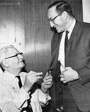 The statistics were compiled by Morris H. Swibel (1920-1998), Vice President of Marina Management Corporation. (Right) Morris Swibel (right in photo) and John Kolpack, a tailor for Marina City Valet Service. |