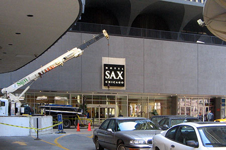 (Left) A new sign for Hotel Sax is installed on the morning of July 2, 2007. The moment was captured by Adam Kaplan, Director of Marketing for Hotel Sax. |