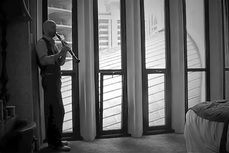 (Left) Dino Soldo in a frame from his 2009 music video titled “Clarinet.” The video was shot in a hotel suite at Hotel Sax to promote a new CD called “The Hotel Suites.” “When trying to do things on the road,” said Dino, who also played keyboard and wind instruments for Leonard Cohen, “sometimes the best location is where you’re standing.” |