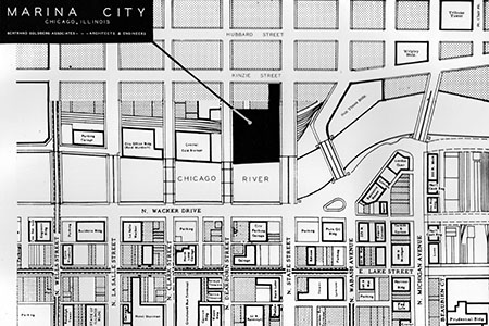 (Left) 1959 map by Bertrand Goldberg Associates of their proposed Marina City site north of Chicago Loop. |