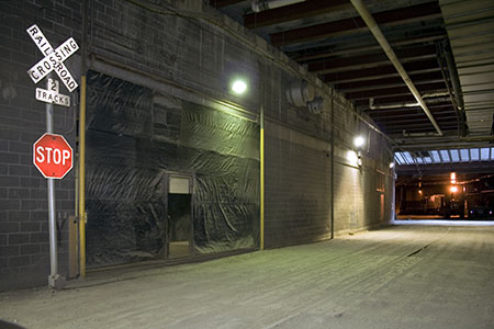 (Left) Abandoned railroad tracks, photographed in 2007, barely visible in the ground at lower right, extending east and west directly below a private driveway at Marina City. The grating at right is the driveway entrance from State Street. |