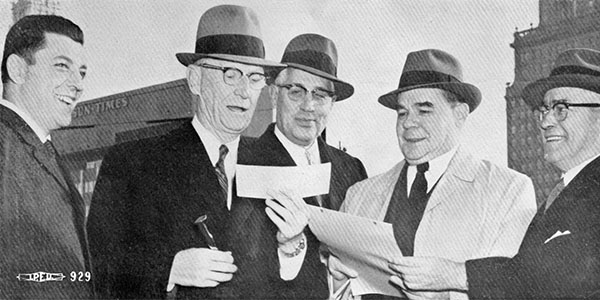 (Left) Photo from January 1960 Local 46 Union News. Left to right: Charles R. Swibel, William L. McFetridge, Paul W. Goodrich, Clyde J. Fitzpatrick, and Leo J. Sheridan. |