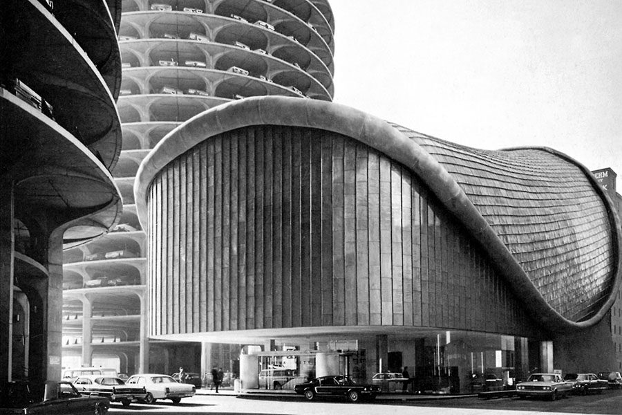 (Left) Early design of the theater building at Marina City. Drawn for Bertrand Goldberg Associates, the artist has signed his or her name as “Branham.” Image provided by The Art Institute of Chicago. |