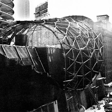 (Left) Early in the construction of Marina City’s theater building in 1963 from the 1985 book Dans La Ville. |