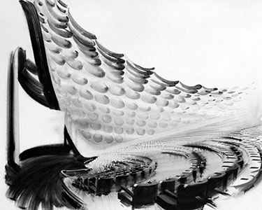 He compared the building to the physical structure of an arm. “Where the exterior concrete frame of the theater touches the ground, we have the elbow. At the extreme cantilevered reaching end, we have the hand. And high up, we have the shoulder. The roof is slung by means of catenary [curved] cables between the hand and the shoulder. The seats – the gallery – is supported along the concrete arm itself.”