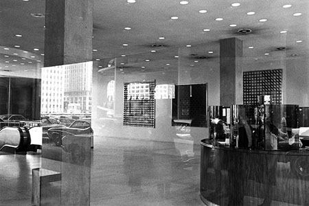 (Left) Close view of theater building lobby from northeast corner of building. In lower left frame, an escalator is visible, inside the lobby, which led to the lower level of the commercial platform. The parking cashier station can be seen at right. Also visible are three paintings, commissioned by Bertrand Goldberg, by Victor Vasarely, a Hungarian-French artist. |