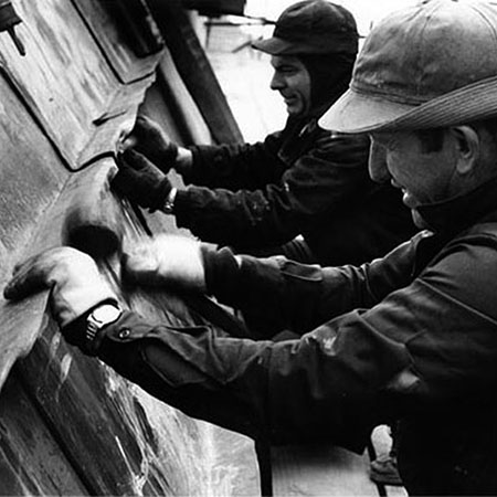 | (Right) Workers install lead roof of theater building in 1965. | ![]() |