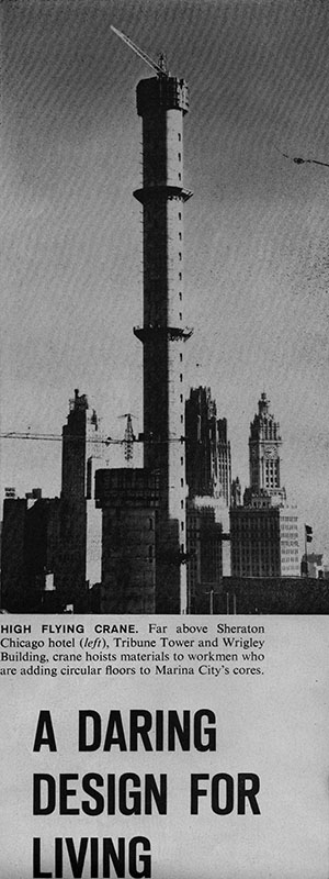 On July 13, Marina City made the society page of the Chicago Daily Tribune when Eleanor Page Voysey wrote about John T. Beatty and his wife, Mrs. John T. Beatty. A bridal dinner on September 7 would be the last big party at their spacious home in Winnetka because they would soon move to an apartment at Marina City with “a southeast view from one of the top floors.” Life magazine featured a pictorial in its February 23, 1962, issue on nine new skyscrapers in Chicago, including a young Marina City. “Soaring up like giant beanstalks only two blocks from the Loop, the twin 60-story towers of Marina City apartments are the most daring of all the additions to Chicago’s skyline,” began Chicago: City of Exciting New Skyscrapers. Photographers Andreas Feininger and Robert Kelley captured daytime and nighttime images of Marina City under construction, then consisting mostly of just two concrete cores. Bertrand Goldberg was mentioned, with the article noting the Marina City architect “has broken with the stark simplicity of [Ludwig Mies van der Rohe] to lead what one observer calls a ‘movement against right-angle thinking.’” (Left) Life’s caption: “High Flying Crane. Far above Sheraton Chicago Hotel, Tribune Tower and Wrigley Building, crane hoists materials to workmen who are adding circular floors to Marina City’s cores.” |