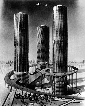 “Sketch by Chicago Daily News art director George Charney shows three circular 60-story towers planned to be erected by the developers of the now-building twin-towered Marina City. Site is on a 16-acre tract just north of Chicago’s downtown area and close to the present Marina towers. One of the striking features of the development is a great elevated roadway, winding around the towers in a gradually ascending spiral. Parking garages will be incorporated within the towers.” |