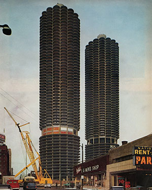 Seen from south on Dearborn Street in the fall of 1962, it shows the west tower almost completed. Dearborn is closed because the bridge is being rebuilt. On the corner of Dearborn & Wacker is E. G. Men’s Shop. To the right is an entrance to a parking ramp and car rental business. (Left) The caption reads: “Chicago’s newest apartment house is Bertrand Goldberg’s Marina City, 65-story cylinders scalloped round with balconies. Lower floors serve as ramp garage. Structure has been called Chicago’s most amazing since the 1893 Ferris wheel.” |