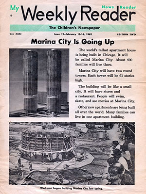 “The world’s tallest apartment house is being built in Chicago,” read the cover story in February 1962. “It will be called Marina City. About 900 families will live there.” (Right) Cover story about Marina City in the February 13-16, 1962, issue of My Weekly Reader. |