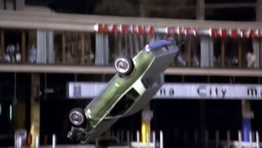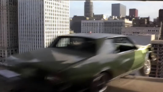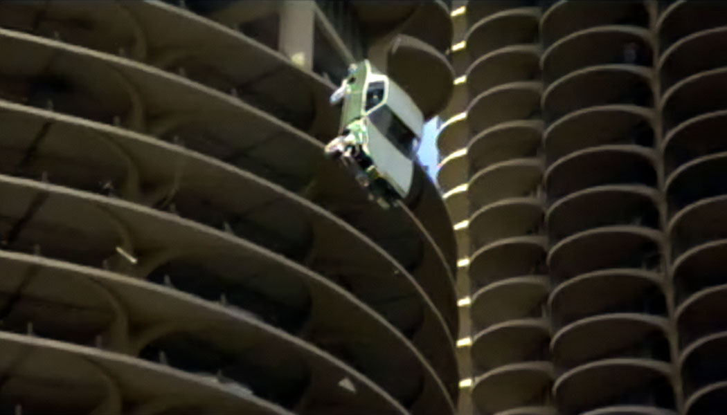 The car was a green 1980 Grand Prix Pontiac. With a dummy and a movie camera in the front seat, the car moved at 40 miles per hour, guided by a stunt man running behind it. He then locked a throttle that was rigged to the trunk. The car crashed through a fake cable barrier made of wood on the 17th floor of the ramp and dived hood-first into the Chicago River, landing halfway across.