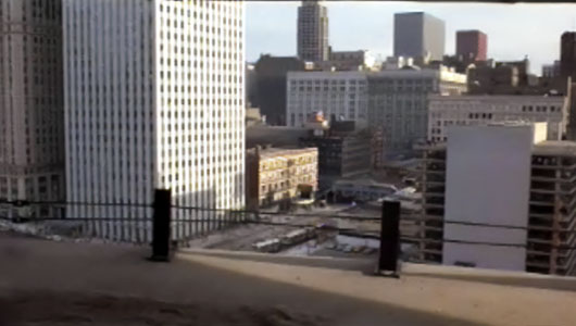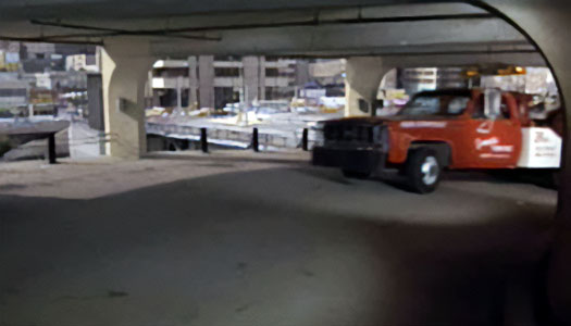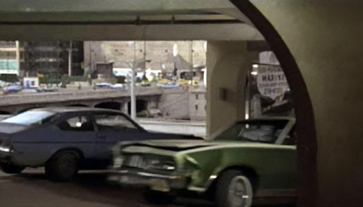 McQueen follows Bernardo up the west tower parking ramp. In the distance, what is now The Westin Chicago River North. The address on the awning is 310 North Dearborn Street. |