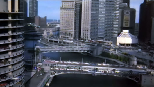 Directly below the flying car, the empty area is now a Smith & Wollensky restaurant. Directly behind the car is the present location of Sheraton Grand Chicago Riverwalk. |
