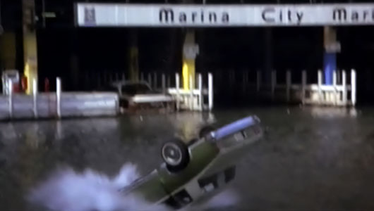 The car is falling past two large signs – for Marina City Restaurant and Marina City Marina. |
