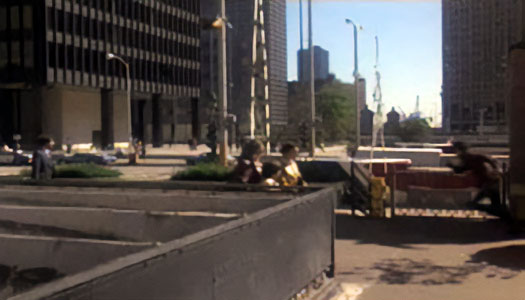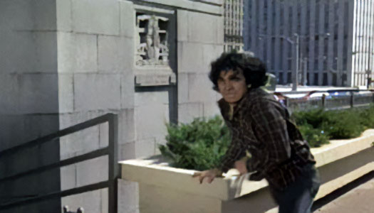 Thomas Rosales Jr., in his portrayal of villain “Bernardo,” climbs over planters – still there today – between the State Street bridge house and the present location of Smith & Wollensky. Rosales has appeared in more than 100 films, mostly as a stunt performer and villain.