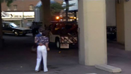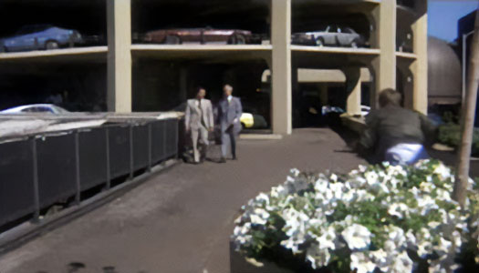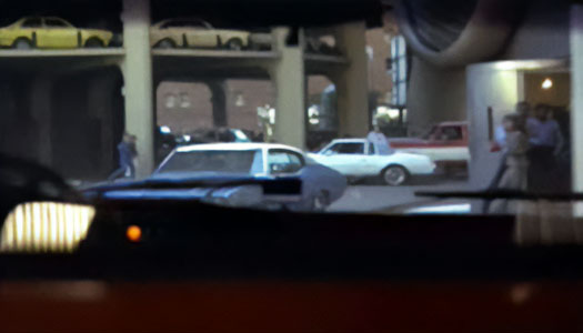 Bernardo has backed up and is turned toward the west tower parking ramp. McQueen borrows a tow truck and follows in pursuit. From inside the truck, we see a valet stand near the southeast corner of the theater building. This valet stand has since been moved to a larger glass-enclosed structure on the other side of the driveway. |