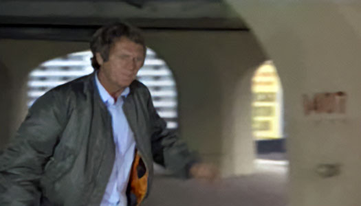Steve McQueen, as Ralph “Papa” Thorson, has also climbed over the planters and runs toward the east tower. The area at left is now the restaurant. The large awning in the distance at right has since been taken down. |